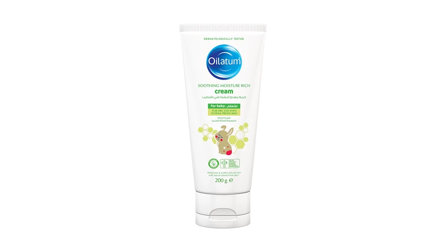 أويلاتوم كريم مهدئ للبشرة غني بالترطيب للأطفال مناسب للاستخدام على وجه وجسم ويدي الأطفال من اليوم الأول، يغذي ويحمي البشرة مع خصائص الشوفان الطبيعي المهدئة، خالٍ من العطور، سريع الامتصاص، غير دهني، وطويل الأمد، مُصاغ خصيصًا لبشرة الأطفال الجافة والمعرضة للإكزيما. يرطب ويغذي ويحمي الحاجز الطبيعي للبشرة